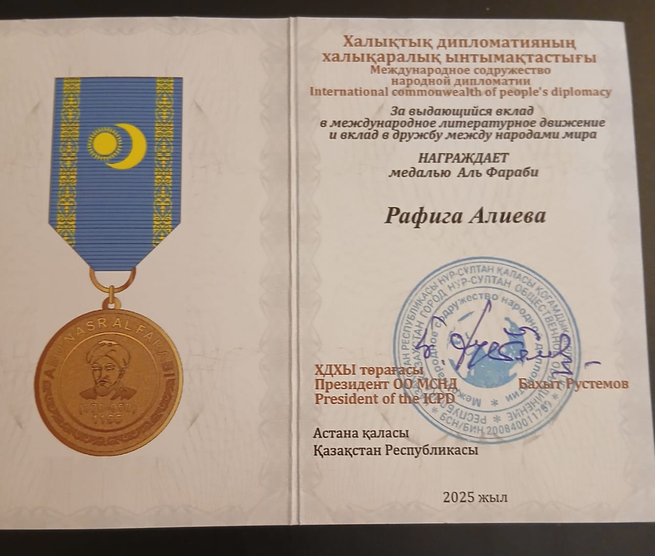Bu nüfuzlu mükafat elm, mədəniyyət və fəlsəfənin inkişafına, eləcə də beynəlxalq əməkdaşlıq və humanitar əlaqələrin möhkəmləndirilməsinə verdiyi əhəmiyyətli töhfələrə görə verilir. 2025-ci ildə həmyerlimiz, fəlsəfə doktoru, professor, Azərbaycan Yazıçılar Birliyinin üzvü və Beynəlxalq Professorlar Akademiyasının (ABŞ) üzvü Rafiq Yəhya oğlu Əliyev millətlərarası və regionlararası münasibətlərin, fəlsəfi düşüncənin və müasir cəmiyyətin inkişafına verdiyi əhəmiyyətli töhfələrə görə Əl-Fərabi medalı ilə təltif edildi.