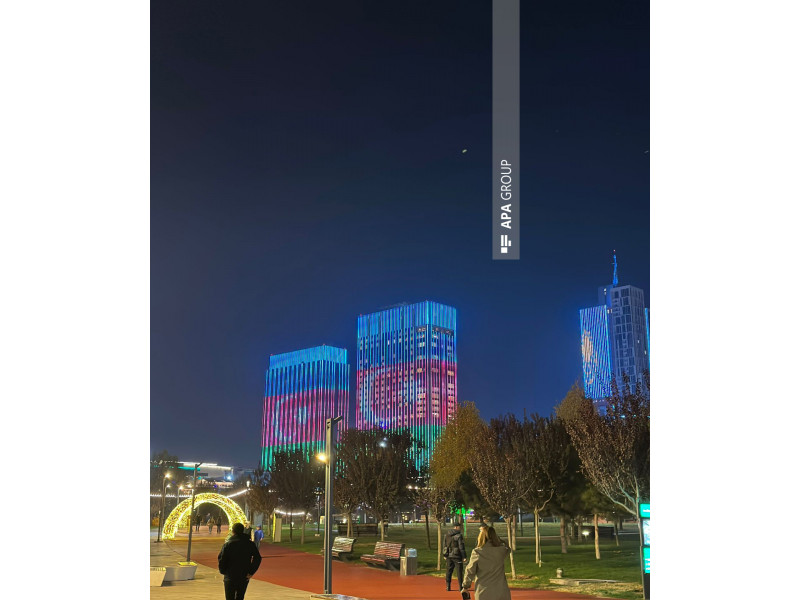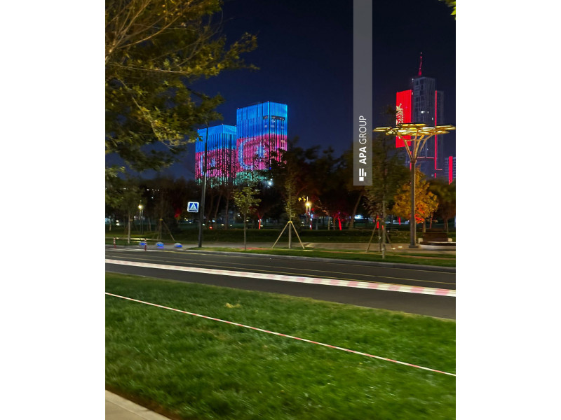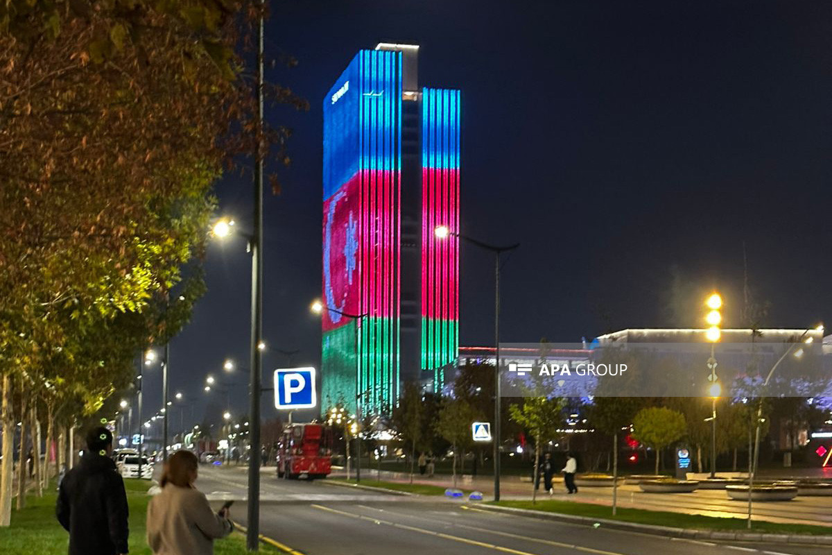 Daşkəndin küçələrində binalar üzərində Azərbaycan bayrağı proyeksiya olunub