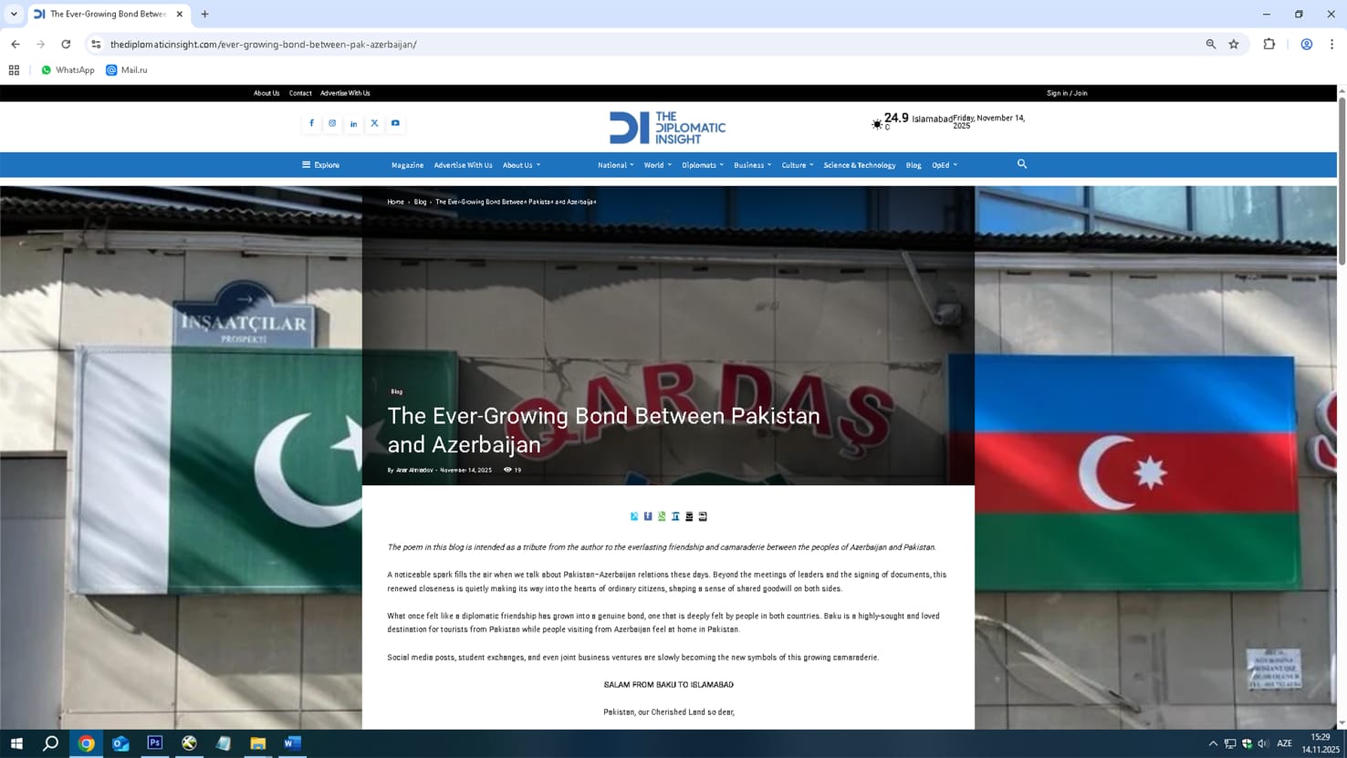 Daxili İşlər Nazirliyinin Daxili Qoşunlarının “Əsgər” qəzetinin redaktoru mayor Anar Əhmədovun Azərbaycan və Pakistan xalqlarının əbədi dostluq və qardaşlığına həsr etdiyi “BAKIDAN SALAMLAR İSLAMABADA” adlı şeiri ingilis dilinə tərcümə olunaraq (“SALAM FROM BAKU TO ISLAMABAD”) Pakistanın nüfuzlu diplomatik nəşri olan “The Diplomatic Insight” jurnalının saytında həm Azərbaycan, həm də ingilis dillərində yayımlanıb.