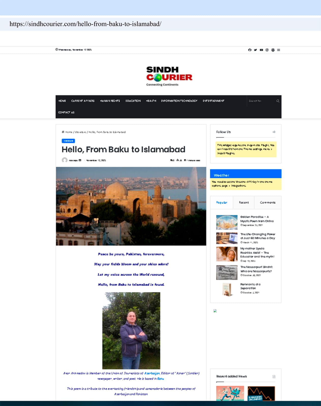 Zabitimizin Pakistan mediasında yayımlanan şeirini aşağıdakı linklərə daxil olaraq oxuya bilərsiniz: