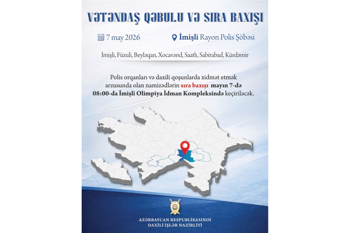 Bildirilib ki, İmişli Rayon Polis Şöbəsinin inzibati binasında baş tutacaq qəbulda İmişli, Füzuli, Beyləqan, Xocavənd, Saatlı, Sabirabad və Kürdəmir rayonlarının sakinləri iştirak edə bilərlər.