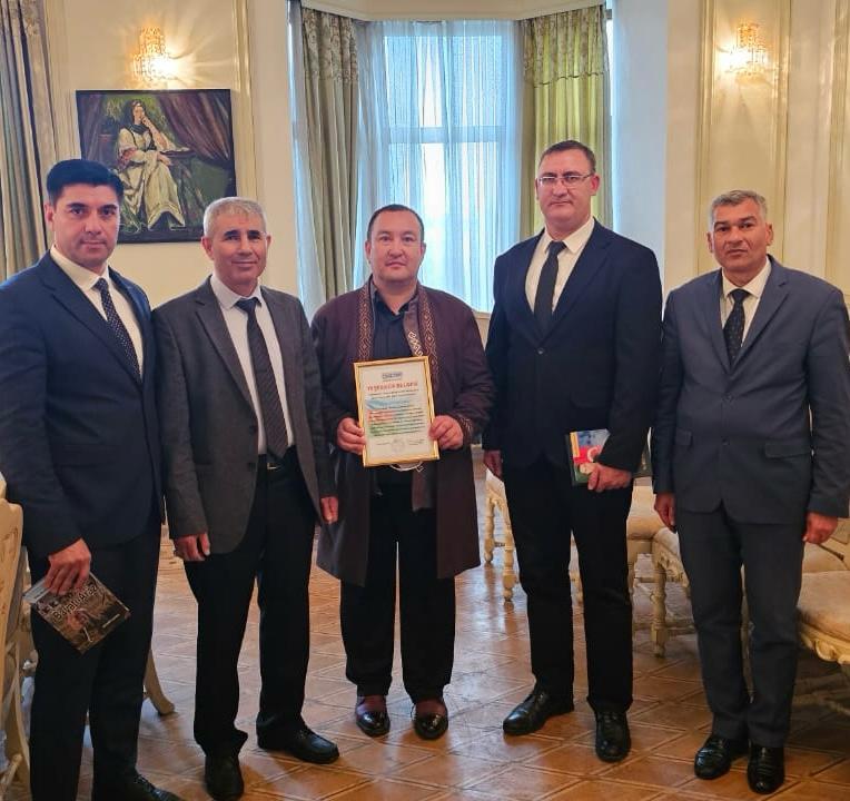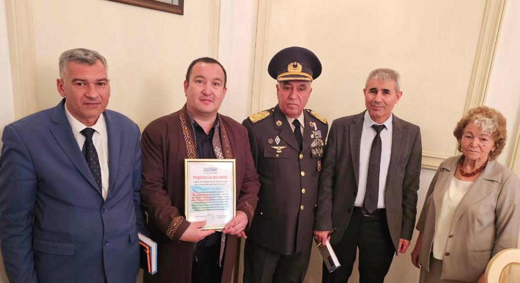 Qazaxıstandan gəlmiş şair-tərcüməçi, DGTYB Məsləhət Şyrasının üzvü Sayat Kamşıger də ürək sözlərini bölüşüb və Etibar Muradxanlıya qazax çapanı bağışlayıb.